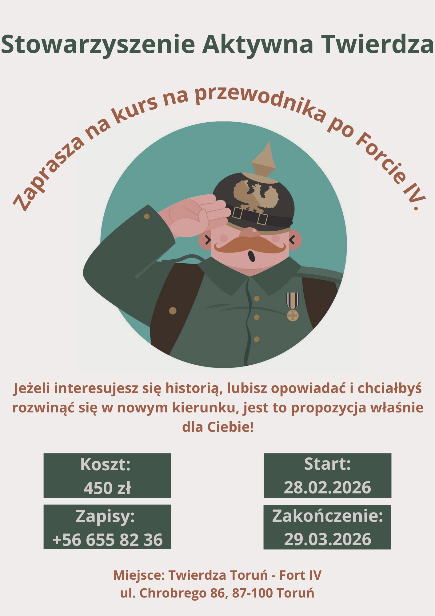 Zapraszamy na kurs na przewodnika i animatora w Forcie IV! Po ukończeniu kursu uczestnicy mogą zostać licencjonowanymi przewodnikami w Forcie IV! Zapisy drogą telefoniczną pod numerem (+48 56) 655 82 36, drogą mailową - biuro@fort.torun.pl lub w recepcji Fortu IV.
